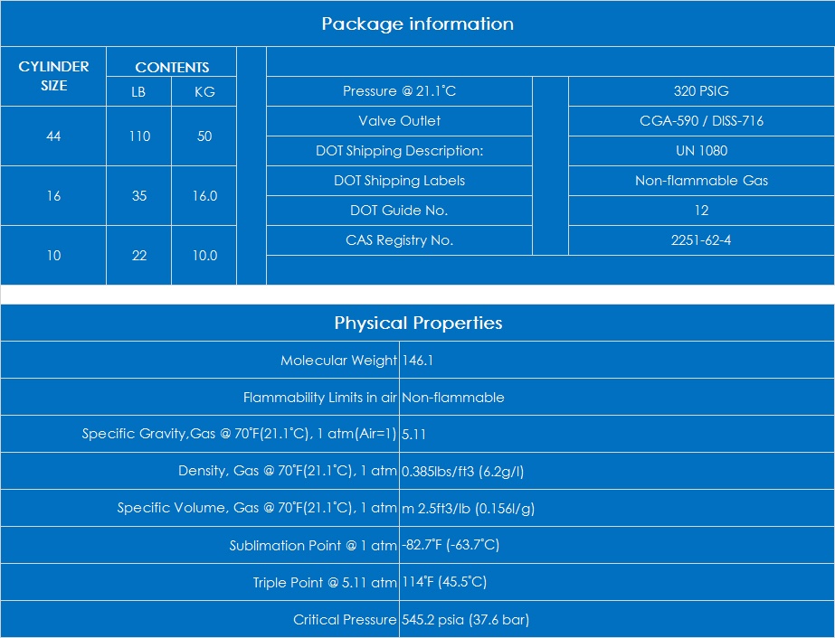 Sulfur hexafluoride(SF6) is a colorless, odorless, non-toxic, non-flammable inert gas with a molecular weight of 146.07 and a density of 6.1 kg / m3 at 20 ° C and 0.1 MPa, about 5 times the air density. Sulfur hexafluoride is gaseous at ambient temperature and pressure, with a critical temperature of 45.6 ° C, a three-phase temperature of -50.8 ° C and a sublimation temperature of -63.8 ° C at atmospheric pressure. Sulfur hexafluoride molecular structure octahedral arrangement, the bonding distance is small, the bond can be high, so its stability is high, the temperature does not exceed 180 ℃, its compatibility with electrical structural materials and nitrogen similar