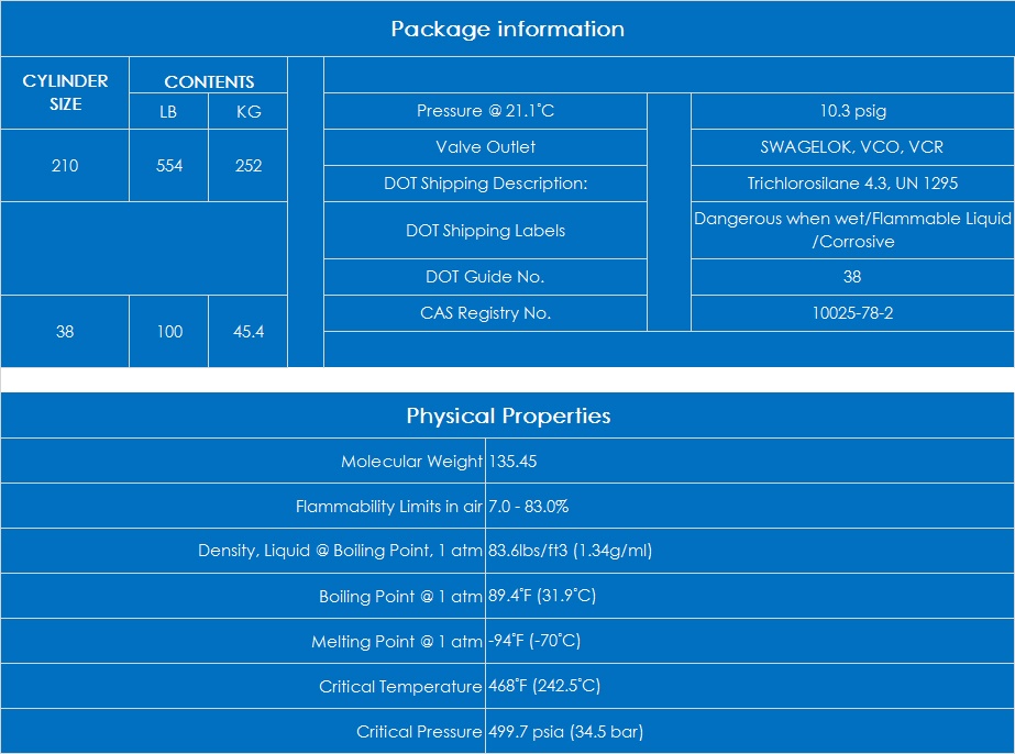 Trichlorosilane(SiHCl3) is a corrosive, colorless, flammable liquid with a suffocating odor. Their vapors are irritating to the mucous membranes and form dense fumes when exposed to humid air. It hydrolyses rapidly in moist air, releasing hydrogen chloride. It is a source of silicon in chemical vapor deposition or epitaxial deposition of silicon. It is shipped in special stainless steel containers, capable of delivering either vapor or liquid.