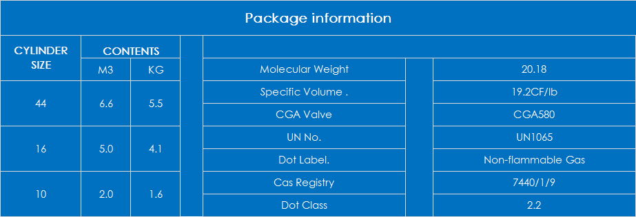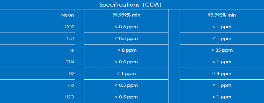 Neon (Ne) is a colorless, odorless, non-flammable, rare gas. Normally neon can be used as a filling gas for colored neon signs for outdoor advertising displays; it can also be used for visual lighting indicators, voltage regulation, and laser mixing gas components.