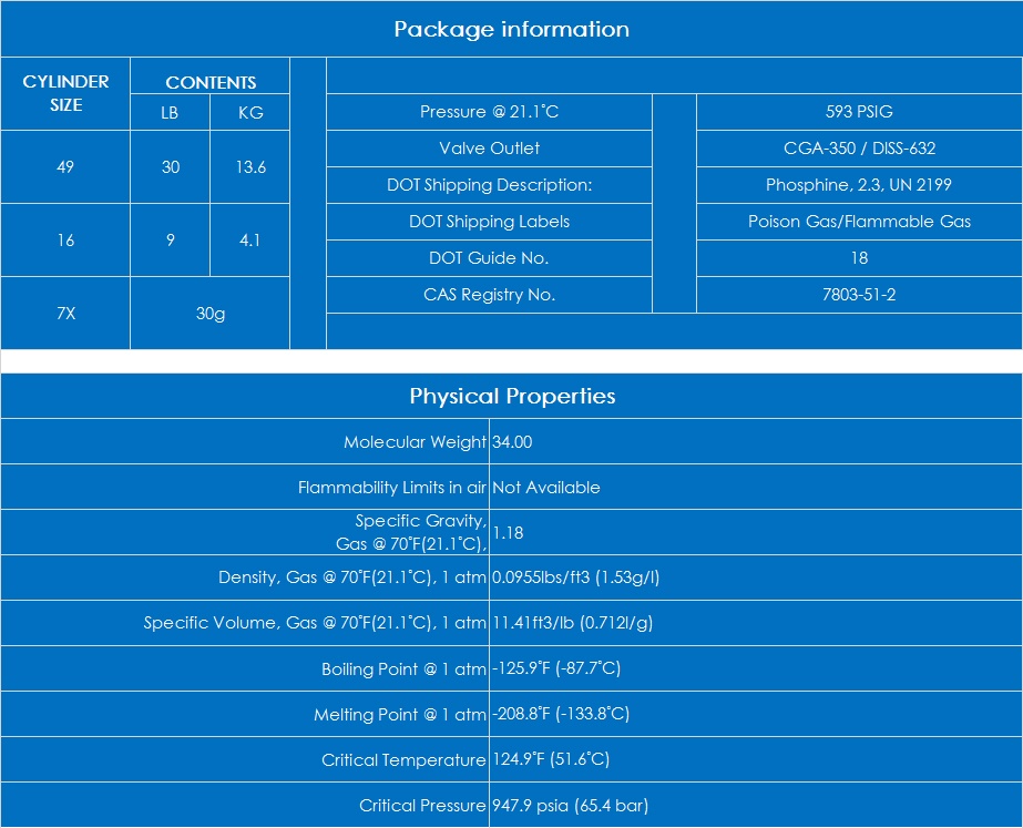 Product Description: Phosphine(PH3) is a colorless and toxic gas with annoying garlic and stinky smell at normal temperature and pressure. The air can burn, if it contains a small amount of P2H4, then spontaneous combustion in the air at room temperature (pure PH3 no below 149 ℃ fire), and prone to explosion.
