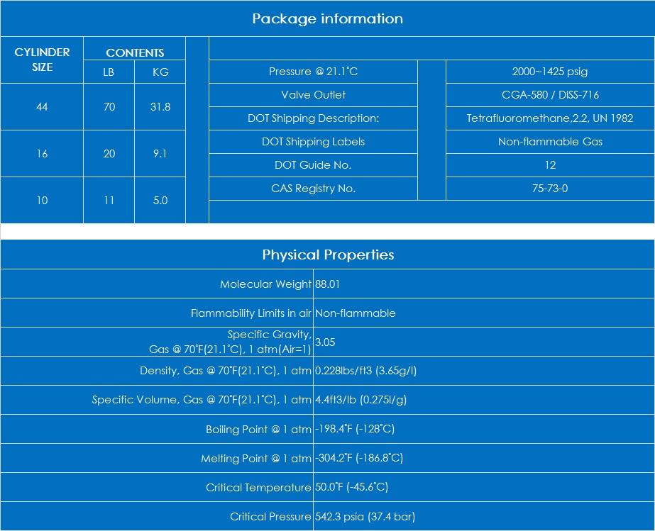 Carbon tetrafluoride(CF4), also known as tetrafluoromethane, Freon-14 and R 14, is a halogenated hydrocarbon (chemical formula: CF4). It can be considered as a halogenated hydrocarbon, methyl halide, perfluorocarbon, can also be regarded as an inorganic compound. At minus 198 ° C, the carbon tetrafluoride has a monoclinic structure with lattice constants of a = 8.597, b = 4.433, c = 8.381 (.10-1 nm) and β = 118.73 °
