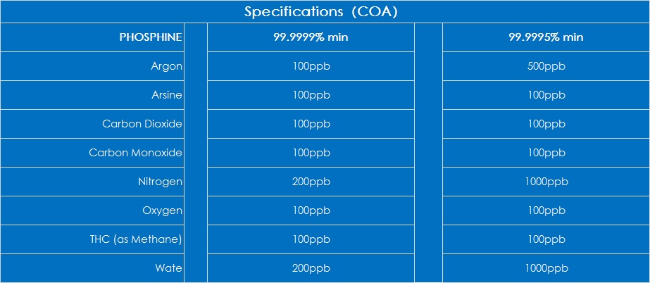 Product Description: Phosphine(PH3) is a colorless and toxic gas with annoying garlic and stinky smell at normal temperature and pressure. The air can burn, if it contains a small amount of P2H4, then spontaneous combustion in the air at room temperature (pure PH3 no below 149 ℃ fire), and prone to explosion. Mainly used in condensation catalysts, polymerization initiators, organic compounds of phosphorus preparation, the occurrence of gas, epitaxial growth, diffusion, ion implantation, etching, chemical vapor deposition, granary insecticide.