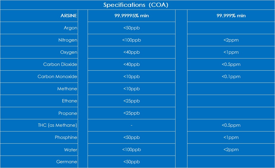 Product Description: Arsine(AsH3) at room temperature and atmospheric pressure is a colorless, highly toxic, combustible gas, garlic smell. Mix with air to form a combustible mixture. Arsenazepam is slightly soluble in water and organic solvents, and easily react with potassium permanganate, bromine and sodium hypochlorite to generate arsenic compounds. Arsine is stable at room temperature and begins to decompose at 230-240 ° C. Arsine(AsH3) is a hemolytic poison that can poison nerves. Uses: Arsine is used in the "N" doping of epitaxial silicon, "N" doping in silicon, ion implantation, GaAs, GaAsP in the semiconductor industry, Group of elements formed by compound semiconductors. Industrially produced arsine is used for organic synthesis.